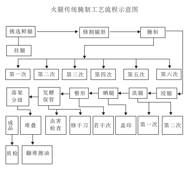 工艺流程:加工须经过修割腿胚,多次腌制、浸腿、洗腿、晒腿、多次整形、发酵保管、落架分级、堆叠、翻堆擦油等流程。业内口诀:“头盐上滚盐,大盐雪花飞,三盐靠骨头,四盐守签头”。