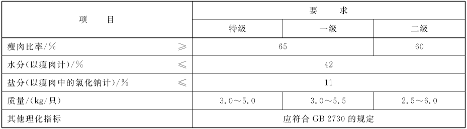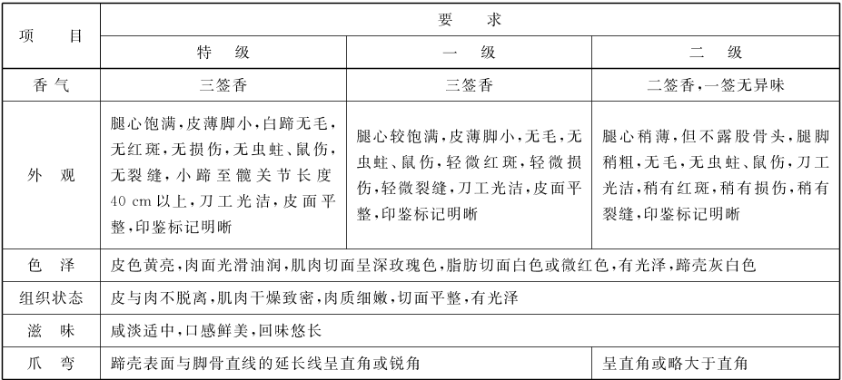 色泽:皮色黄亮、肉色红润、肌肉切面呈深玫瑰色或桃红色,脂肪切面呈白色或微红色,有光泽。