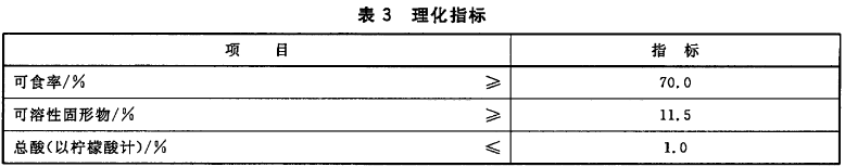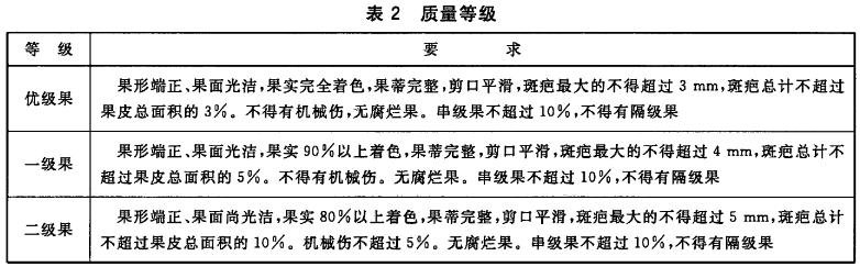 每个规格分为优级果、一级果、二级果三个等级。各级果实要求完整新鲜、果面洁净、风味纯正、香甜可口,应符合表2的规定。